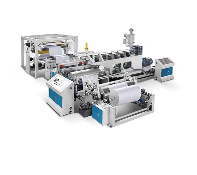 高速单面淋膜机以LDPE、LLDPE、PP、EVA、EAA等涂覆级淋膜树脂为原料,可对纸张,无纺布,编织袋等产品进行单面淋膜。